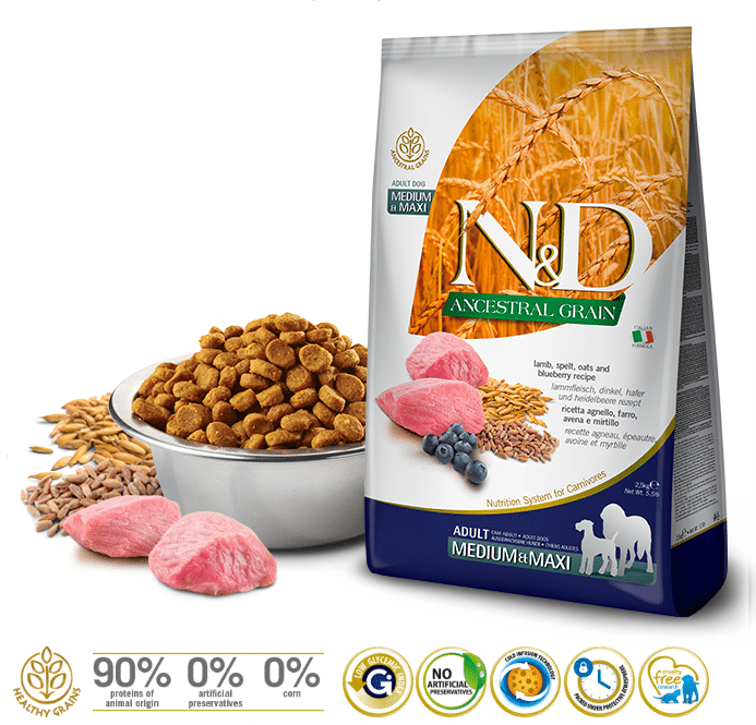N&D Ancestral Grain מתאפיין במדד גליקמי נמוך המאפשר שחרור אנרגיה הדרגתי לאורך היום;