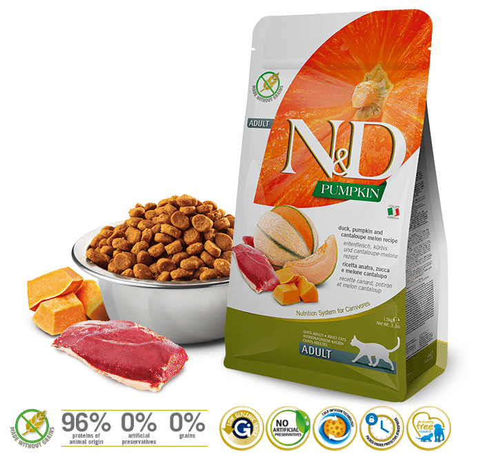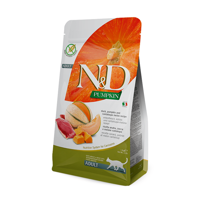 Farmina N&D דלעת ברווז ומלון פותח כדי לעמוד ברמות התזונתיות שנקבעו על ידי פרופילי המזון לחתולים של AAFCO לכל שלבי החיים.