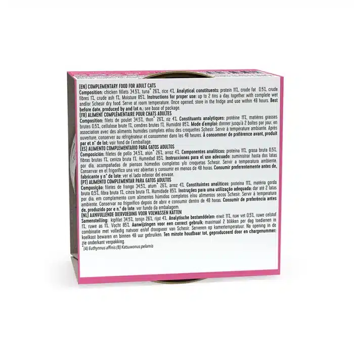 המתכון מבוסס על פילה אמיתי של טונה ועוף טעימים, מבושלים בנוזל שלהם, למפגש טעמים מזמין. לחתולים שאוהבים טעם ועקביות טבעיים.